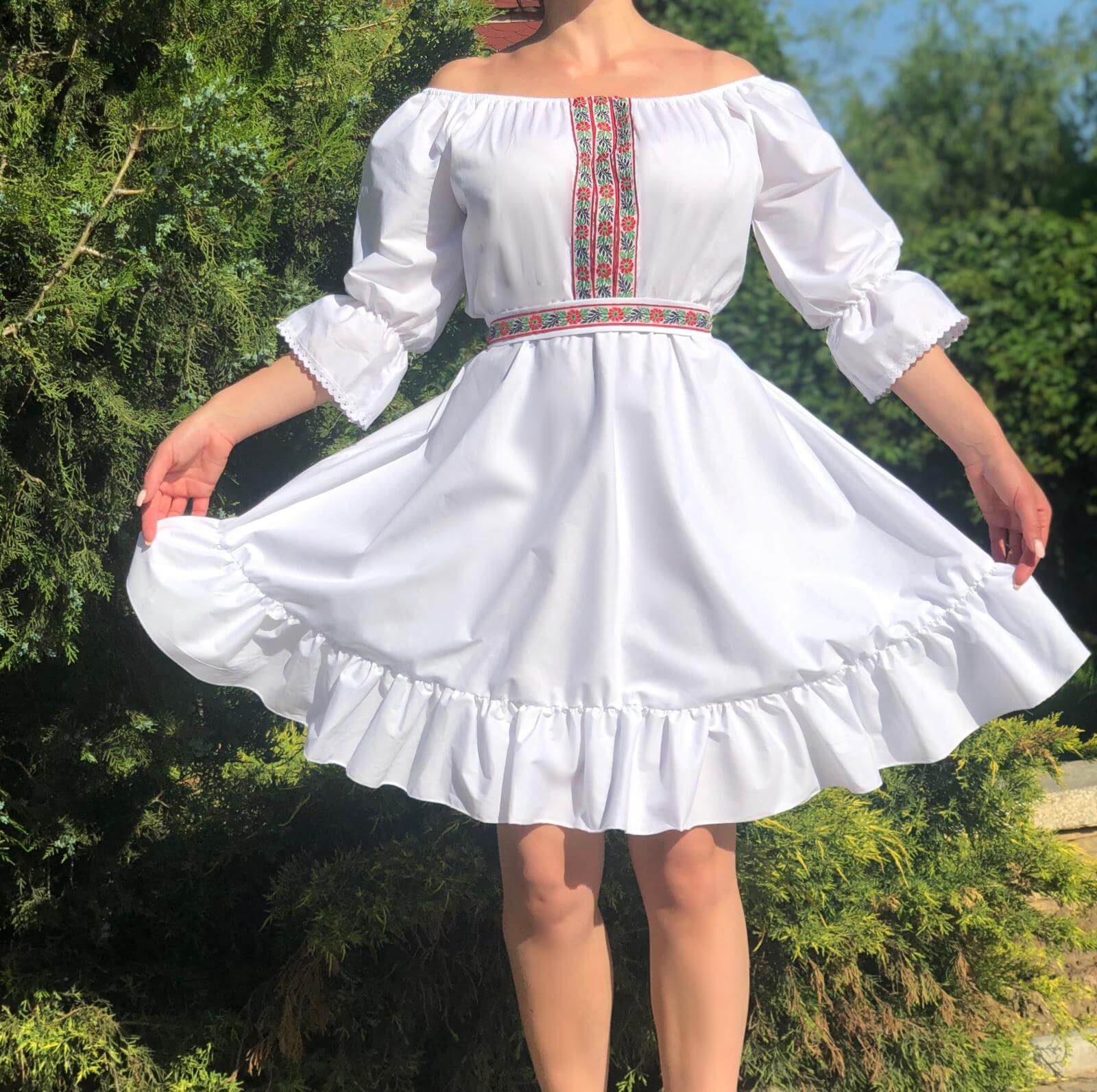 Rochie Traditionala stilizata. Este potrivita pentru orice ocazie. In talie si la decolteu este prevazuta cu elastic, ce ofera lejeritate. Cureaua este din acelasi material si este detasabila.Manecile sunt lungi.