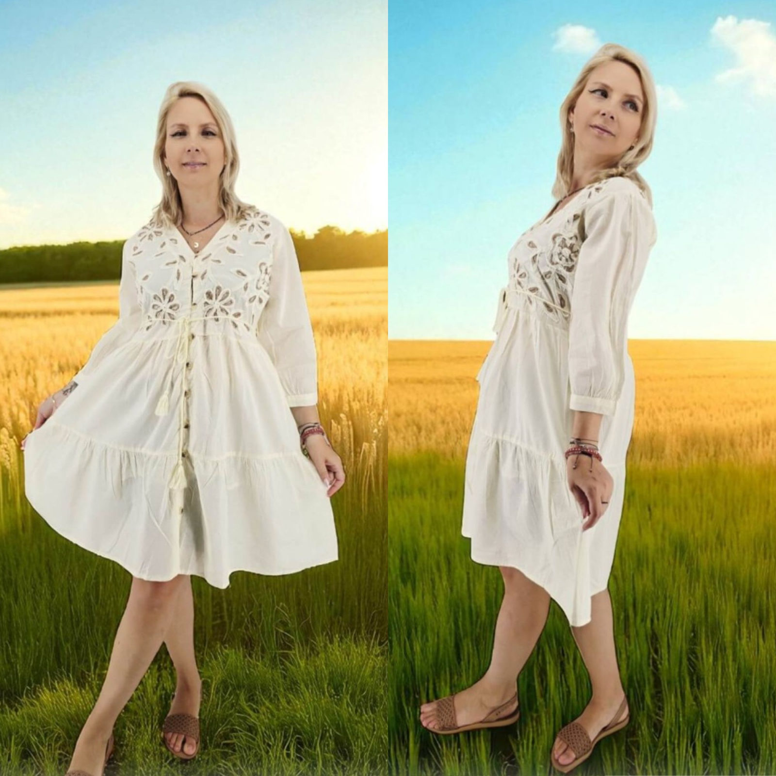 Lejeră, vaporoasă și cu broderii care lasă pielea să respire, această rochie albă cu decupaje florale e tot ce ai nevoie pentru o vară cu stil.