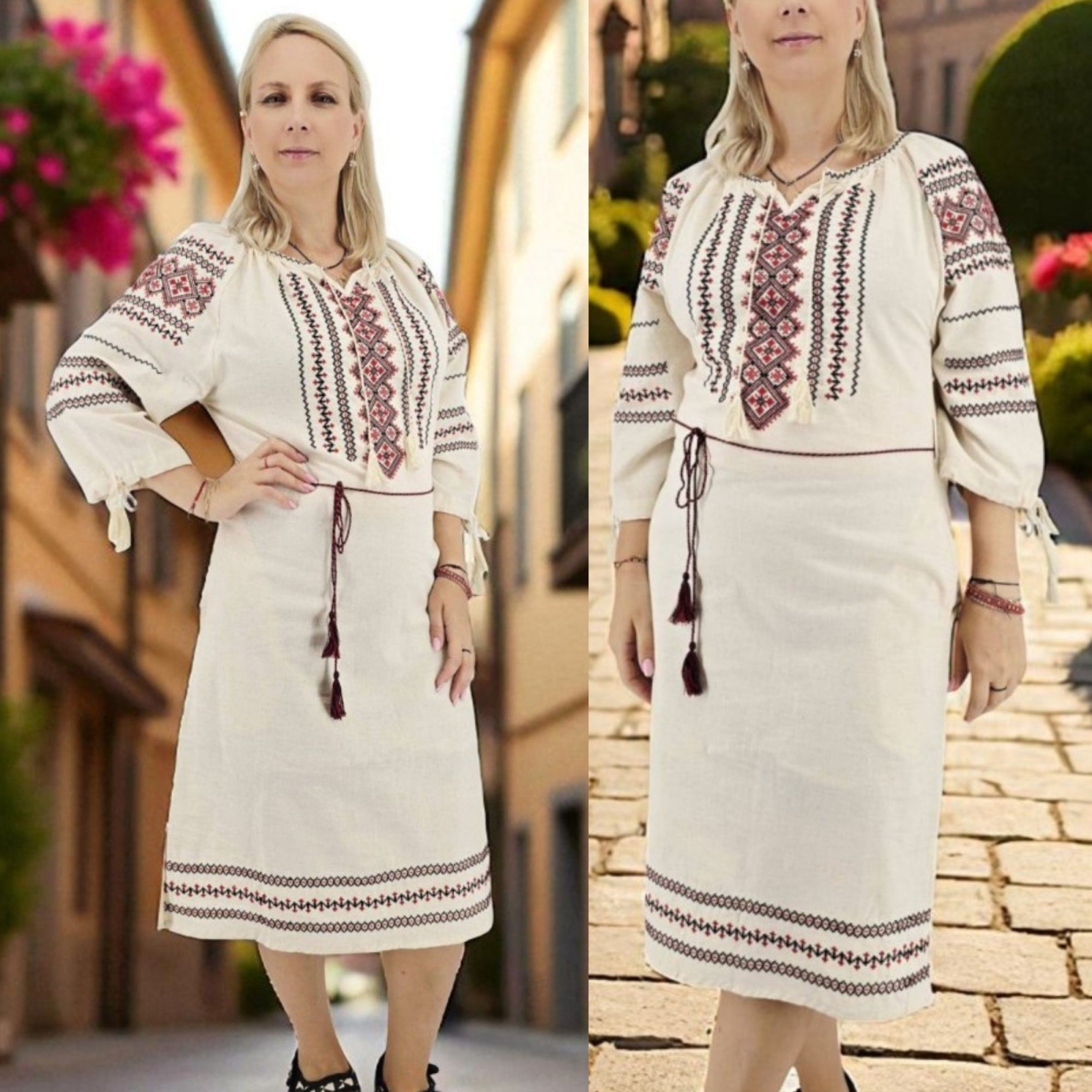 Rochie traditionala midi de culoare crem, din bumbac, cu broderie cu modele traditionale gemetrice Decolteu rotund si maneci 3/4. Este prevazuta cu jupa.