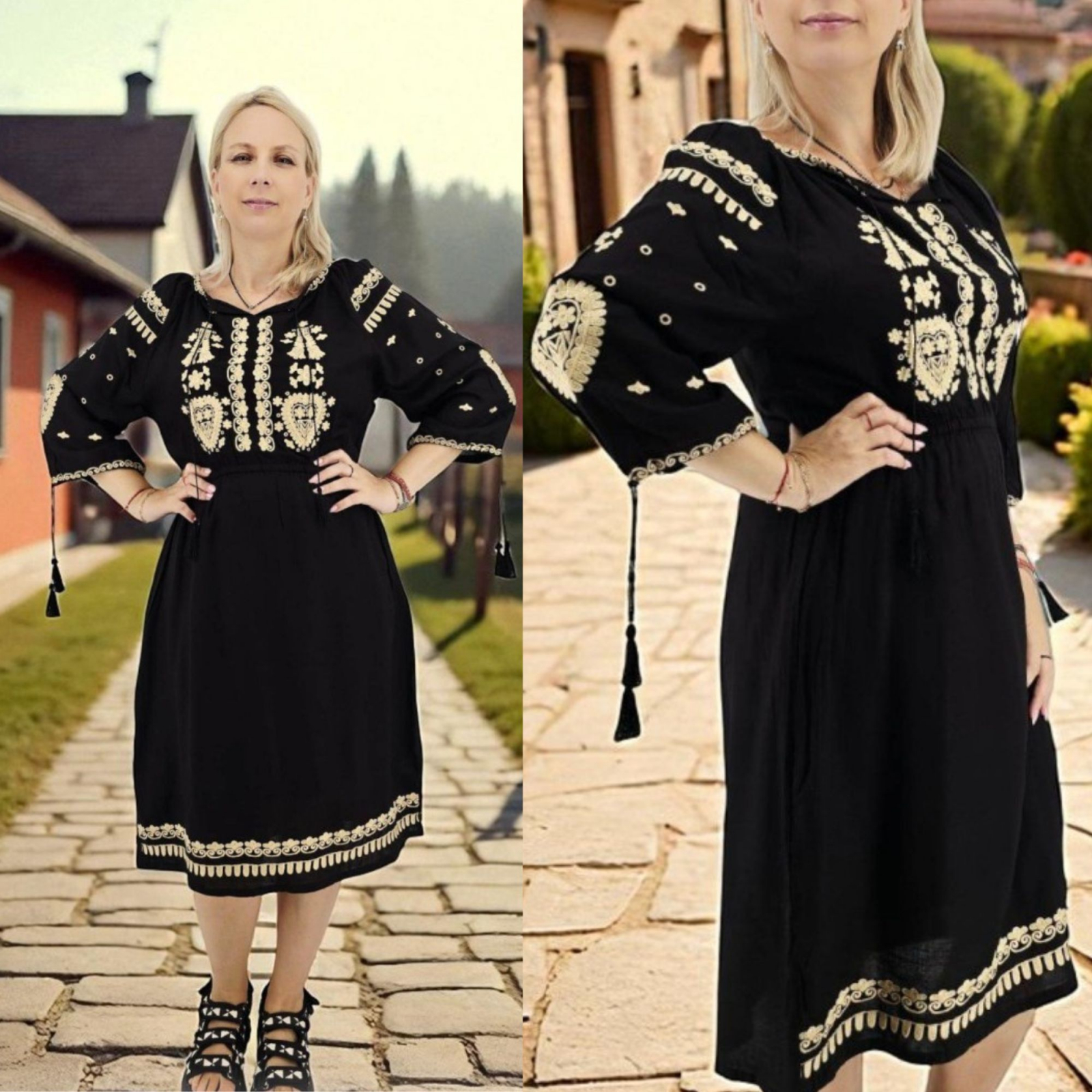 Rochie traditionala de culoare negru  din bumbac, cu broderie cu modele traditionale geometrice. Decolteu rotund si maneci 3/4. Este prevazuta cu jupa.