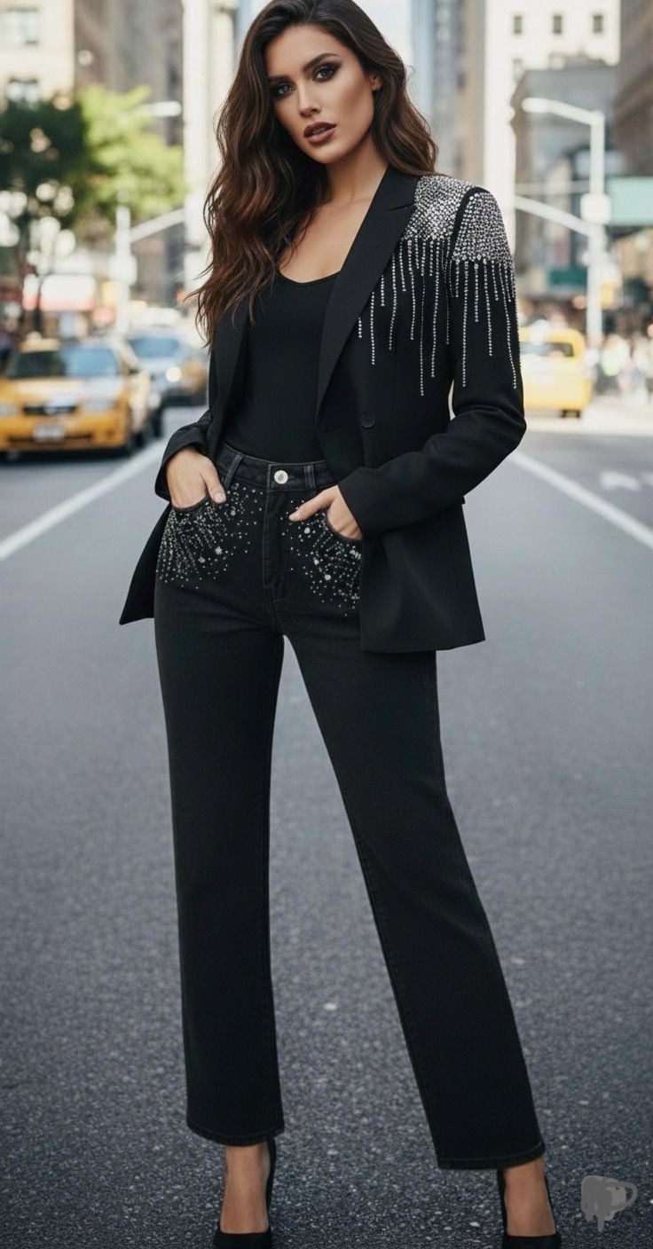 Realizat din material negru cu ținută, sacoul este decorat cu aplicații strălucitoare tip explozie, care reflectă lumina spectaculos la fiecare mișcare. Croiala ușor oversized îl face extrem de versatil: îl poți purta cu pantaloni, fustă, rochie sau chiar peste o ținută all-black pentru un look sofisticat de petrecere.