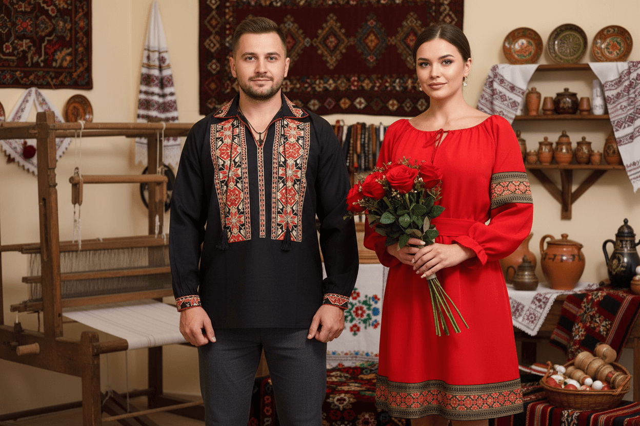 Set Cuplu Traditional 78 / Camasa Traditionala si Rochie cu motive traditionale