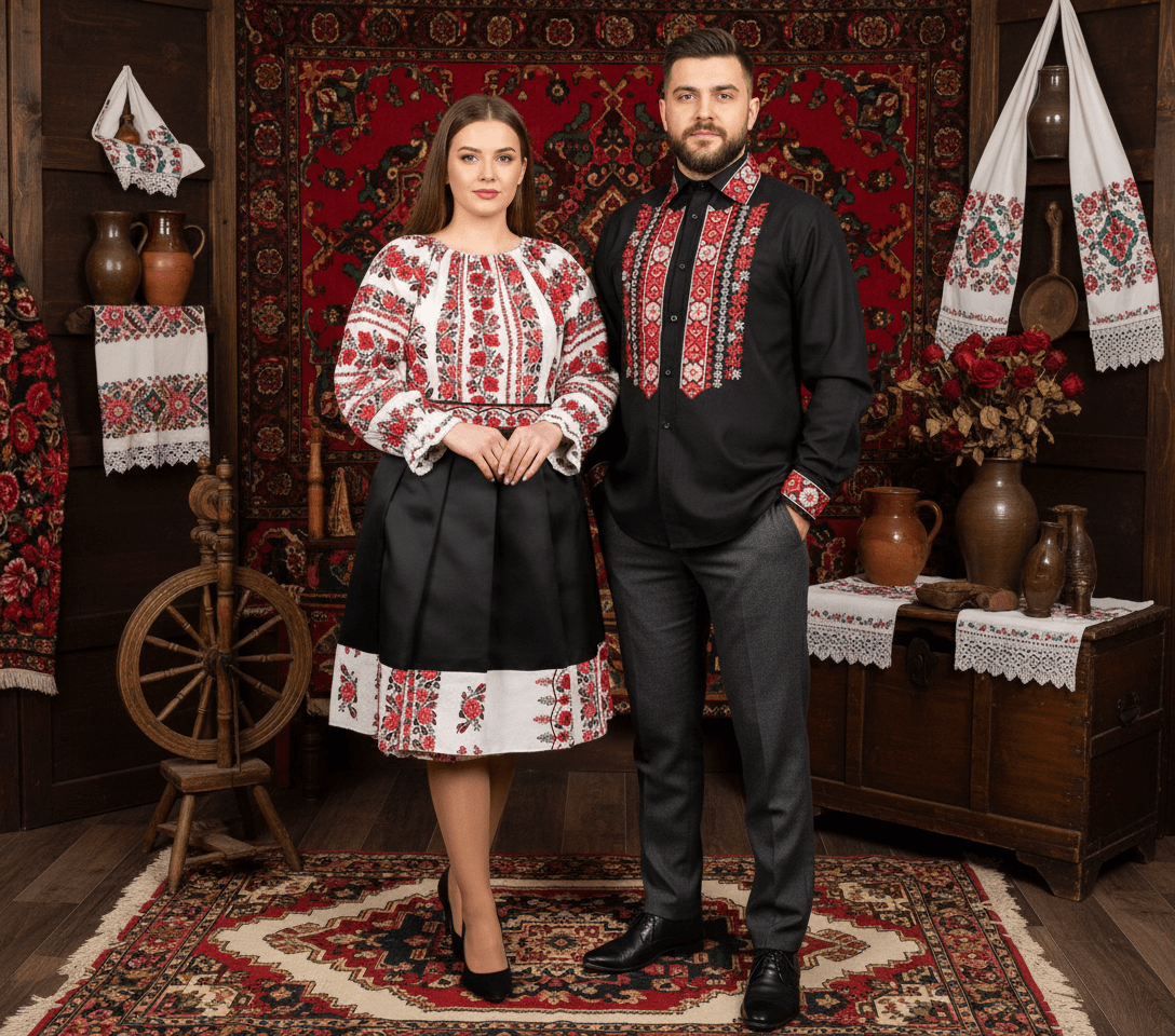 Set Cuplu Traditional 76 / Camasa Traditionala si Rochie cu motive traditionale