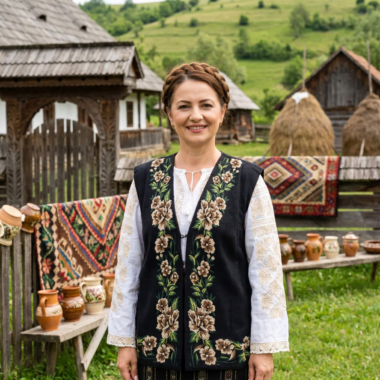 Vesta traditionala femei Mariuca este un articol vestimentar deosebit, ce imbina armonios elemente traditionale romanesti cu functionalitatea moderna. Confectionata dintr-un amestec de lana si acril, aceasta vesta ofera atat confort, cat si o rezistenta sporita, fiind ideala pentru zilele racoroase. Designul vestimentar este accentuat de motive traditionale brodate, inspirate din zona Transilvaniei, recunoscuta pentru bogatia ornamentala si cromatica sa. Culorile predominante sunt negru si auriu, creand un contrast elegant si rafinat. Tehnica de brodare evidentiaza maiestria cu care sunt realizate detaliile florale si geometrice, conferind vestii un aspect unic si autentic. Aceasta vesta poate fi combinata cu diverse tinute traditionale sau moderne, adaugand un plus de distinctie si eleganta oricarui outfit.