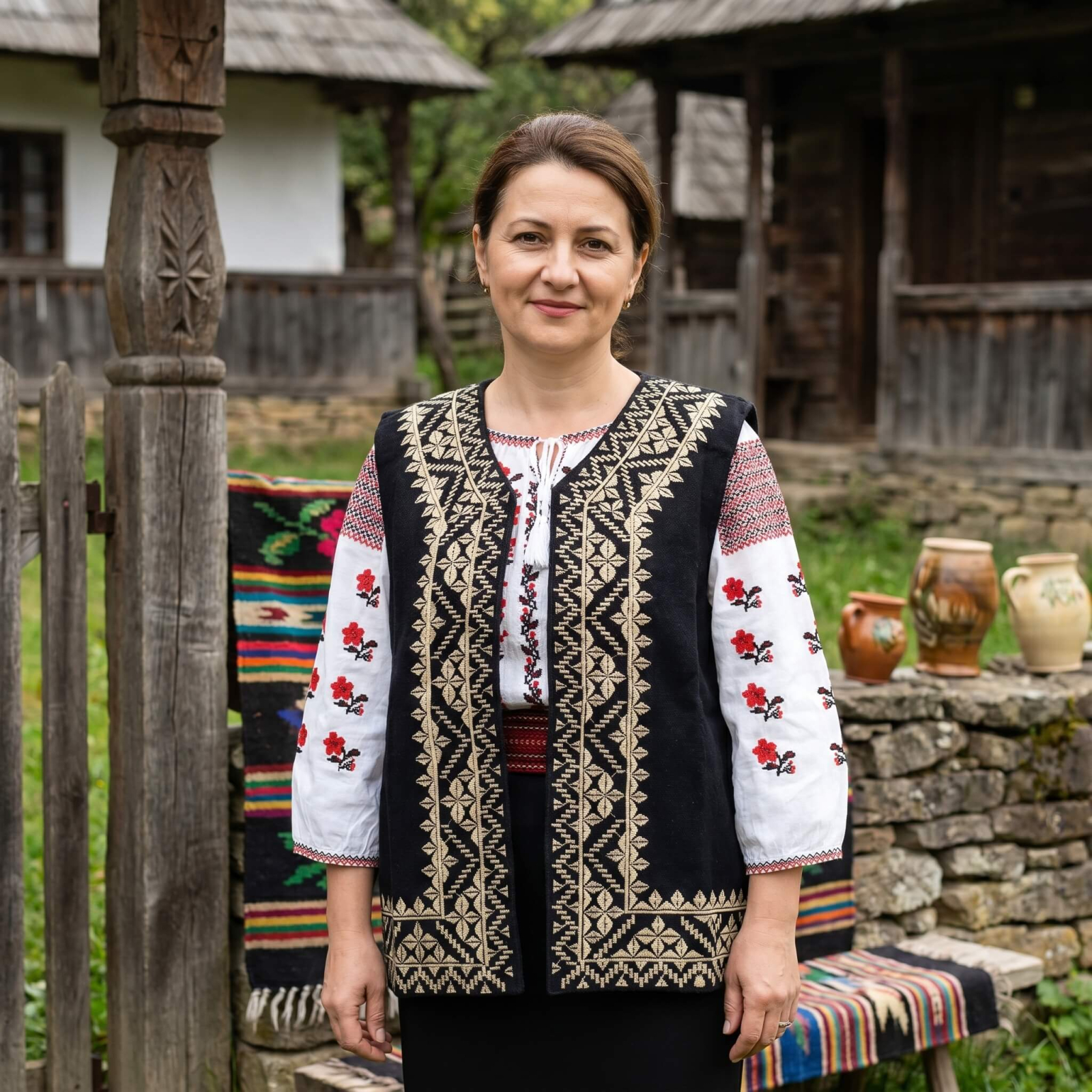 Vesta traditionala femei Otilia este un articol vestimentar deosebit, ce imbina armonios elemente traditionale romanesti cu functionalitatea moderna. Confectionata dintr-un amestec de lana si acril, aceasta vesta ofera atat confort, cat si o rezistenta sporita, fiind ideala pentru zilele racoroase. Designul vestimentar este accentuat de motive traditionale brodate, inspirate din zona Transilvaniei, recunoscuta pentru bogatia ornamentala si cromatica sa. Culorile predominante sunt negru si auriu, creand un contrast elegant si rafinat. Tehnica de brodare evidentiaza maiestria cu care sunt realizate detaliile florale si geometrice, conferind vestii un aspect unic si autentic. Aceasta vesta poate fi combinata cu diverse tinute traditionale sau moderne, adaugand un plus de distinctie si eleganta oricarui outfit.